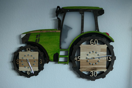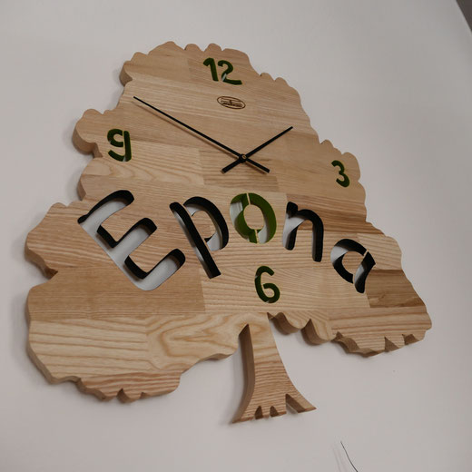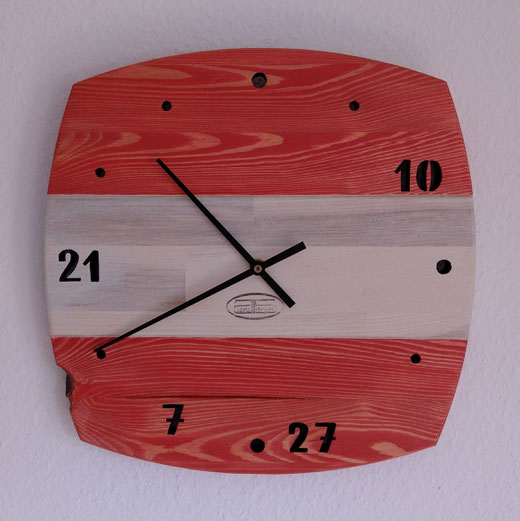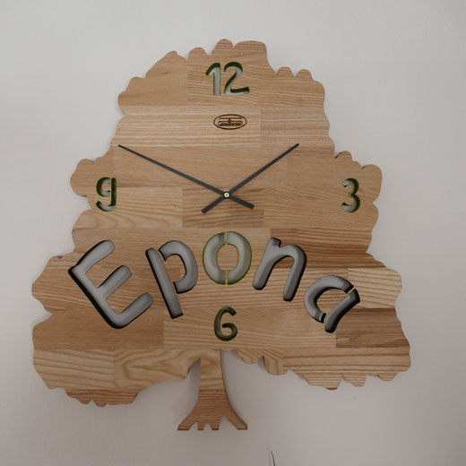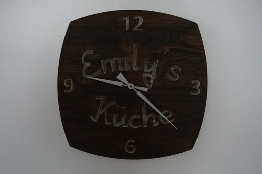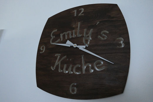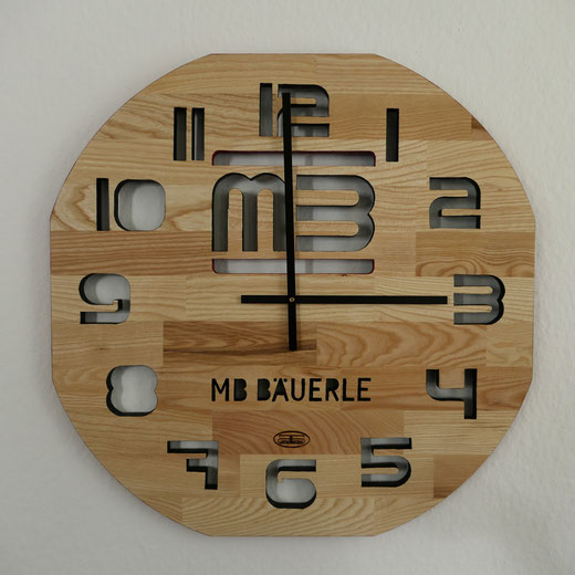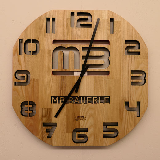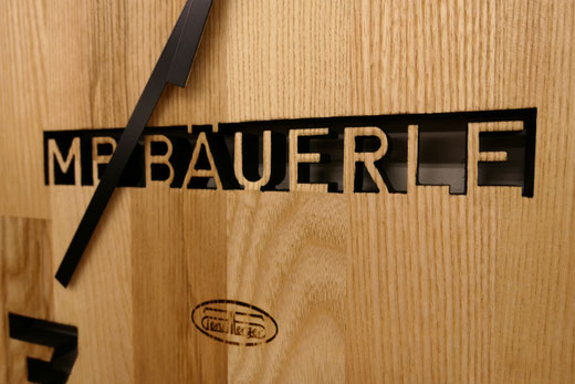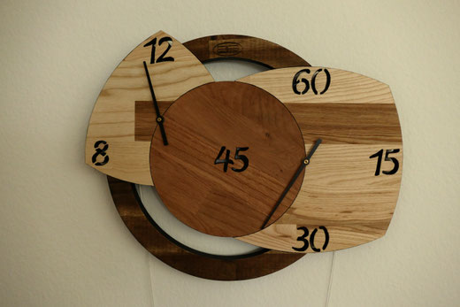 Hierfür verwende ich massive Leimholzplatten, Junghans Quarz Uhrwerke und eigene Zeiger, damit das Design die Größe der Uhr bestimmt.
